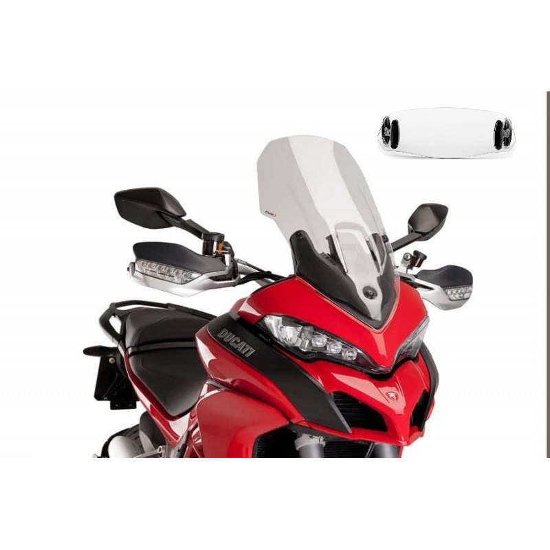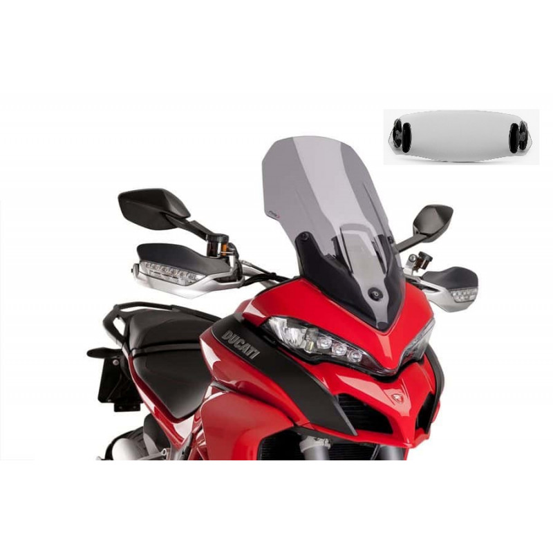 La bulle Touring est équipée d'une visière à réglage multiple fixée avec le système "clip on", offrant ainsi au pilote la possibilité de décider rapidement et facilement s'il souhaite bénéficier d'une protection aérodynamique supplémentaire.