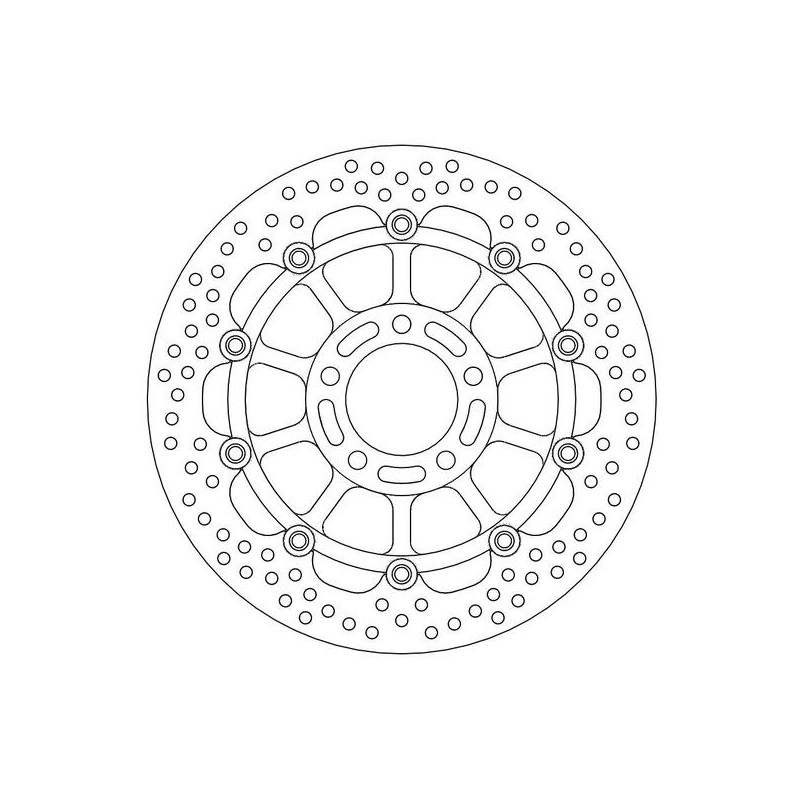 La taille et le positionnement exacts des trous d'aération assurent une dispersion égale de la chaleur sous une contrainte thermique élevée. Ce type de disque de frein existe également en version Racing. Pour de meilleures performances, vous pouvez utiliser des plaquettes de frein Moto-Master.