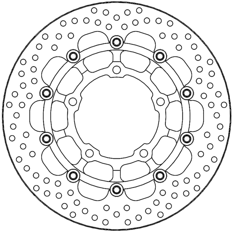 La taille et le positionnement exacts des trous d'aération assurent une dispersion égale de la chaleur sous une contrainte thermique élevée. Ce type de disque de frein existe également en version Racing. Pour de meilleures performances, vous pouvez utiliser des plaquettes de frein Moto-Master.