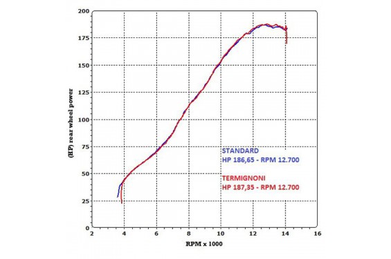 Il permet un gain de poids de 1.35 Kg par rapport à la version d'origine (gain mesuré sur silencieux Titane / Carbone) et vous fera gagner 0.7 Cv a 12 700 Tr/mn, ce qui portera la puissance à la roue à 187.35 cv contre 186.65cv d'origine (mesure à la roue par Termignoni) !