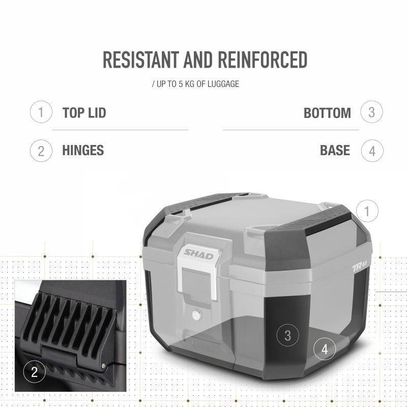 Le Top Case moto Shad Terra TR41 s’adapte aussi bien à un usage urbain qu’aux escapades du week-end. Sa charge maximale recommandée de 5 kg (interne et/ou supérieure) permet de transporter vos effets personnels, équipement pluie, gants ou petits accessoires de voyage en toute sérénité.